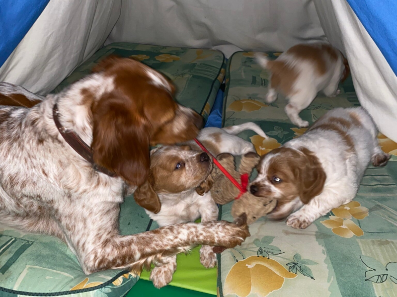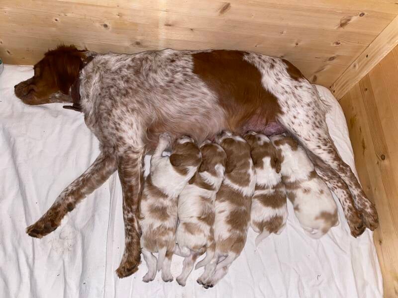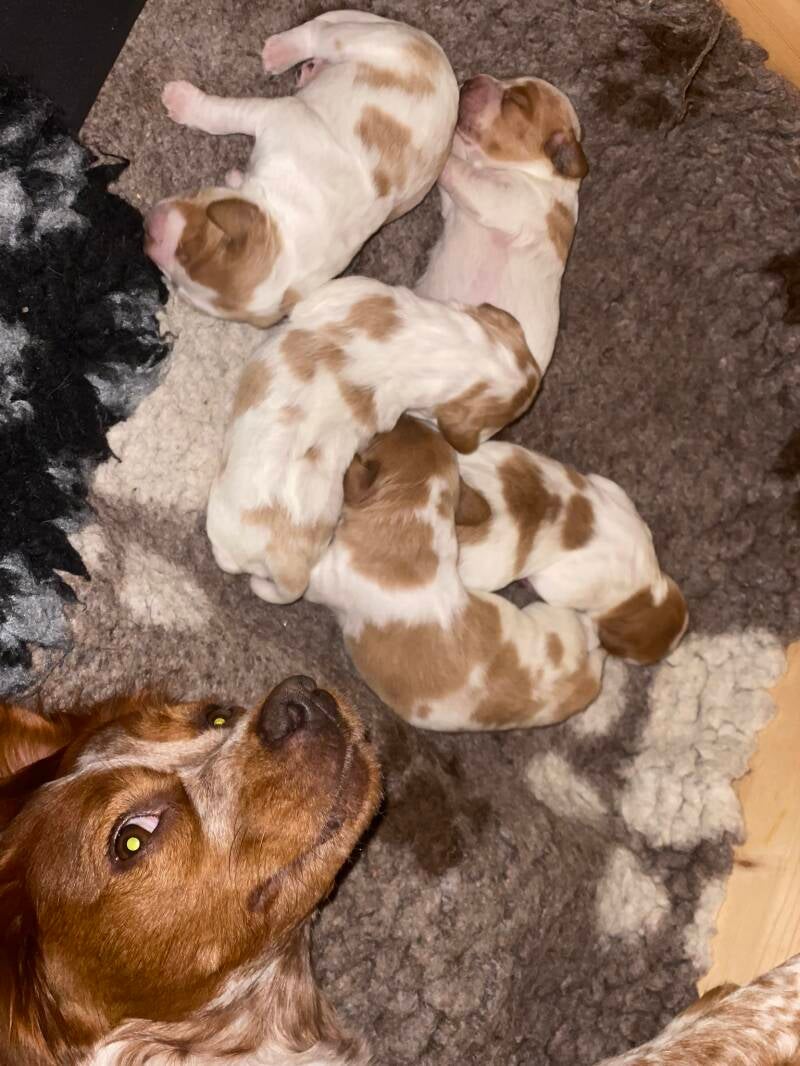 Am 23.03. 2023 sind 5 Welpen geboren worden, davon 3 Rüden und 2 Hündinnen. Alle Welpen sind rot- weiß.